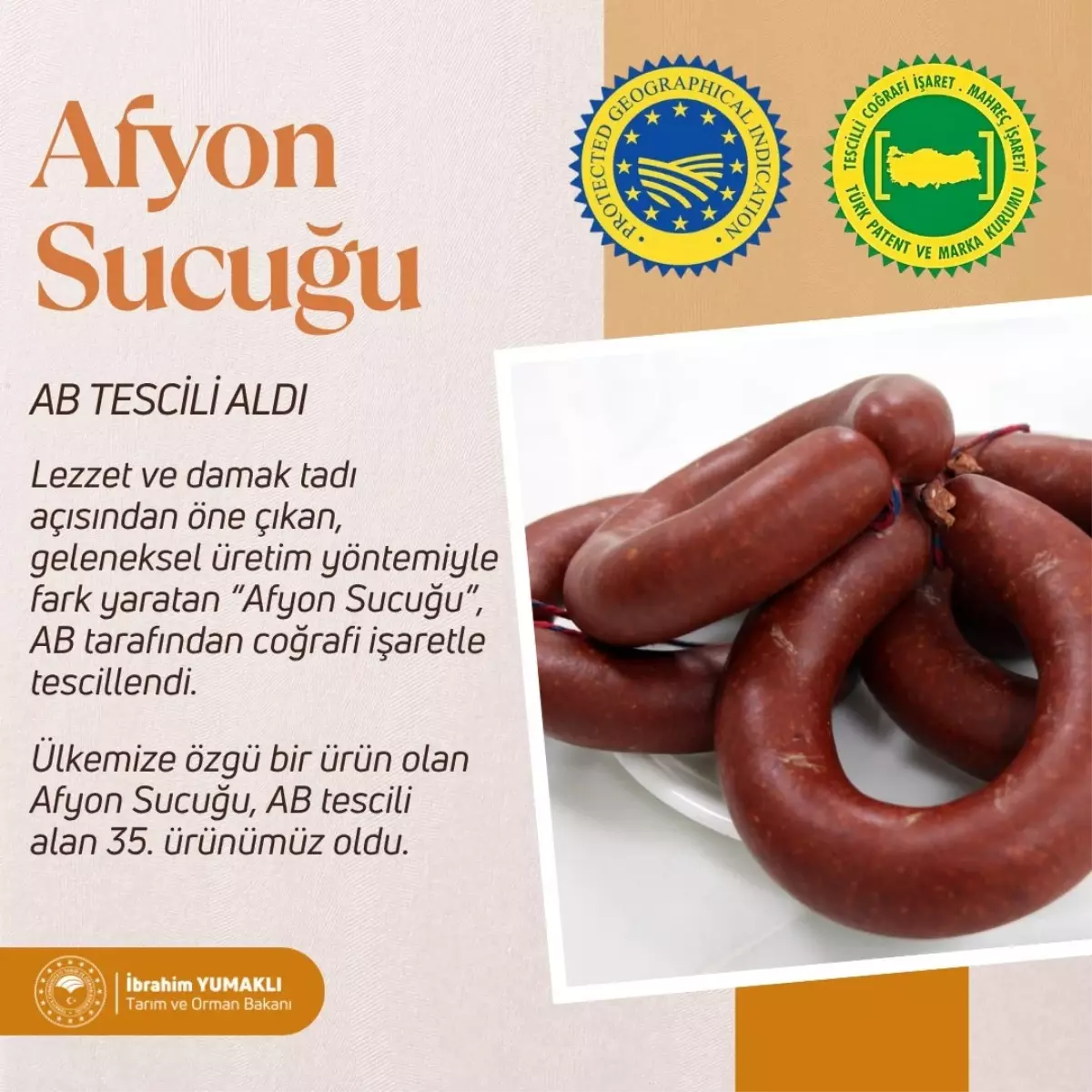 TARIM ve Orman Bakanı İbrahim Yumaklı, Afyon sucuğunun Avrupa Birliği’nden (AB) coğrafik işaret tescili aldığını açıkladı.