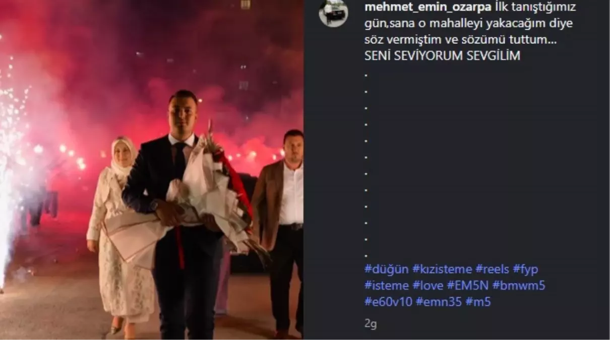 Olay, 23 Haziran’da merkez Selçuklu ilçesinde meydana geldi. Mehmet Emin Özarpa, kız isteme merasimi için arkadaşları ve ailesiyle sevgilisinin yaşadığı cadde boyunca yürüdüğü sırada kendilerini takip eden arabalar caddeyi trafiğe kapadı. Bu sırada çok sayıda meşale ve havai fişek kullanıldı. Vakit zaman yürüyüşü takip eden arabalar egzoz sesleriyle çevreyi rahatsız etti. Özarpa, toplumsal medya hesabından o anların görüntüsünü paylaştı. Mehmet Emin Özarpa paylaşımına, “İlk tanıştığımızda sana o mahalleyi yakacağım diye kelam vermiştim ve sözümü tuttum. Seni seviyorum sevgilim” notunu ekledi.