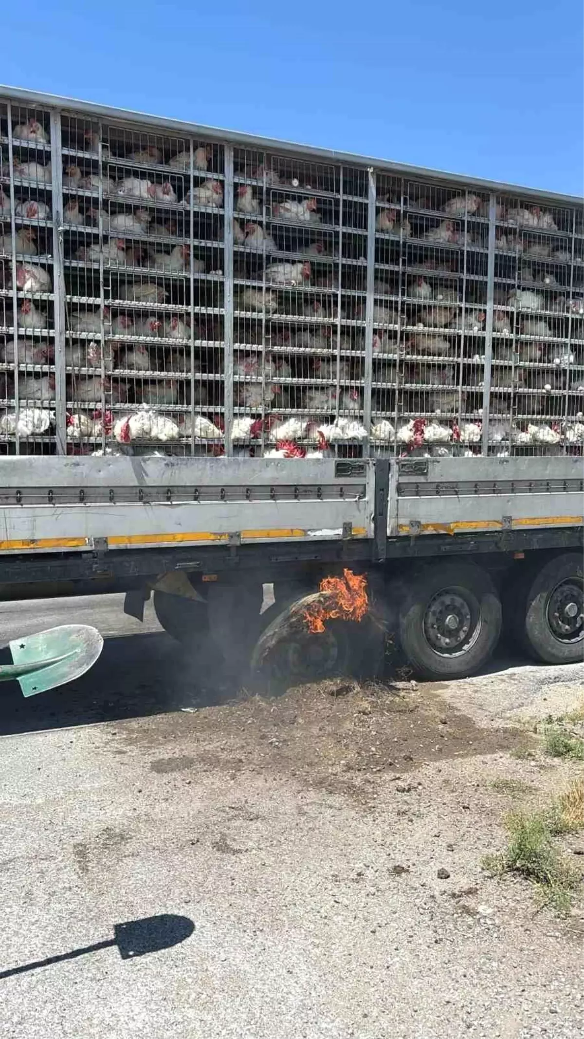 Konya’nın Karapınar ilçesinde canlı tavuk dolu tırın dorse lastiklerinde çıkan yangın paniğe neden oldu.