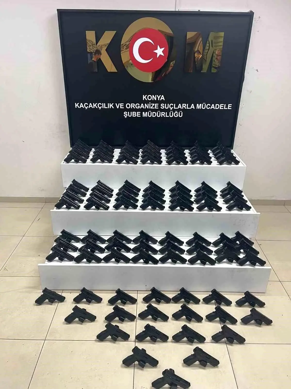 Konya İl Emniyet Müdürlüğü Kaçakçılık ve Organize Kabahatlerle Mücadele (KOM) Şube Müdürlüğü takımları, hata ve suçlularla gayret kapsamında iki farklı operasyon düzenledi. Gruplarca bir araçta yapılan aramada 100 ruhsatsız tabanca ve bu silahlara ilişkin şarjörler ele geçirildi. Silahların yasa dışı yollarla temin edilip satılmak istendiği belirlenirken olayla ilgili 2 kuşkulu gözaltına alındı.